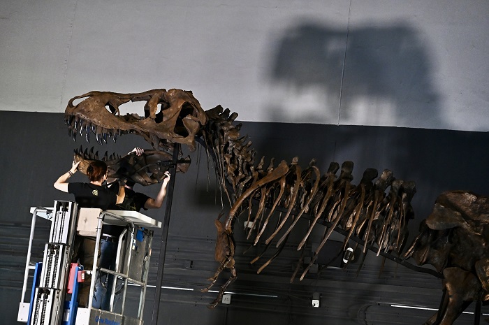 展覽安裝團(tuán)隊正將暴龍頭骨安裝于骨架上。香港科學(xué)館供圖
