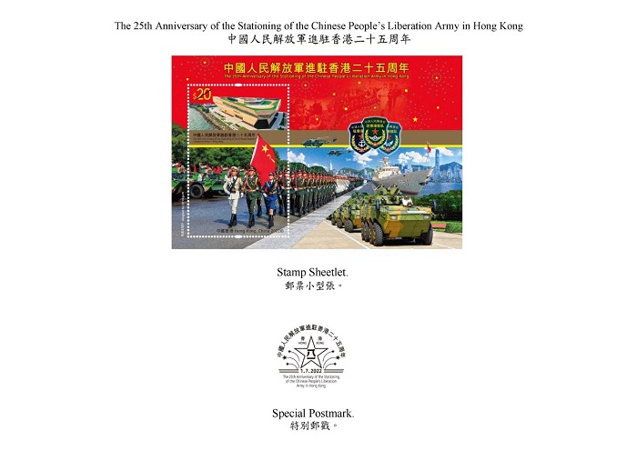中國人民解放軍駐香港部隊(duì)自1997年進(jìn)駐香港以來,一直堅(jiān)決貫徹“一國兩制”方針、香港基本法、《中華人民共和國香港特別行政區(qū)駐軍法》及香港國安法,維護(hù)國家主權(quán)、安全及發(fā)展利益,是維護(hù)香港繁榮穩(wěn)定的重要基石。香港郵政以“中國人民解放軍進(jìn)駐香港二十五周年”為題,發(fā)行一張郵票小型張,以資紀(jì)念。