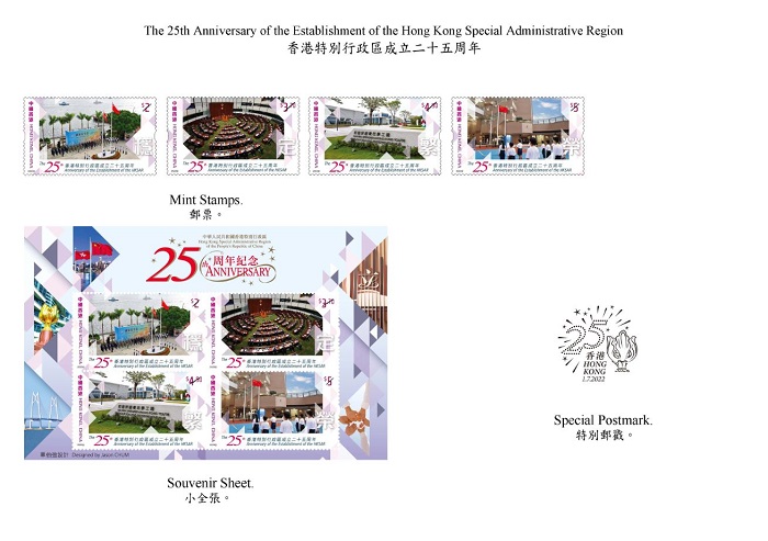 2022年是香港特別行政區(qū)成立25周年,香港郵政將發(fā)行一套四枚紀(jì)念郵票、一張小全張和相關(guān)集郵品,以資紀(jì)念。郵票展示在實(shí)施香港國安法及完善選舉制度后的香港,回到“一國兩制”的正確軌道,以維持長期繁榮穩(wěn)定。這兩項(xiàng)重要舉措維護(hù)國家的主權(quán)、安全和發(fā)展利益,確!耙粐鴥芍啤毙蟹(wěn)致遠(yuǎn)。
