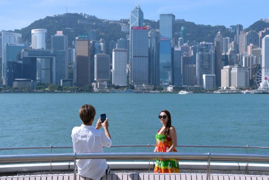 游客在香港尖沙咀拍照留念(10月3日攝)。新華社記者 陳鐸 攝