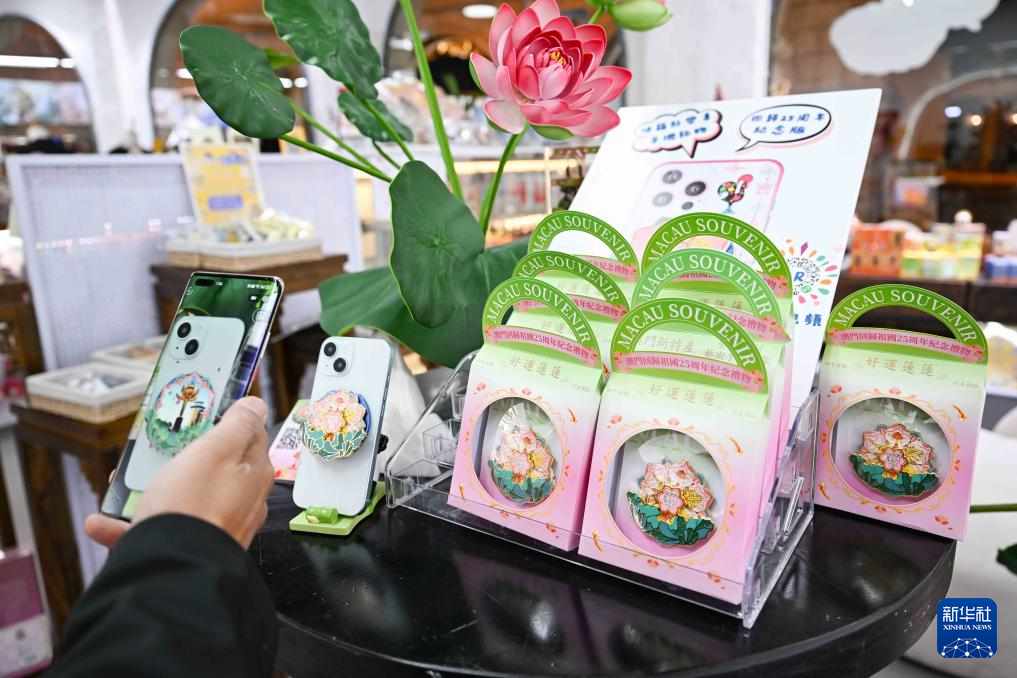 12月17日,游客在澳門一家商店里購買澳門回歸祖國25周年紀(jì)念冰箱貼。