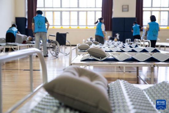9月23日,避險中心工作人員在澳門塔石體育館B館整理床墊。新華社發(fā)(張金加攝)