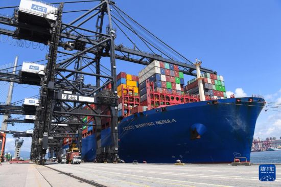 2025年5月22日,一艘集裝箱貨輪在香港貨柜碼頭裝貨。新華社記者陳鐸攝